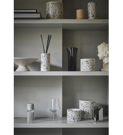 Petit pot avec couvercle décoratif très tendance terrazzo, pouvant accompagner dans une salle de bain le miroir terrazzo.